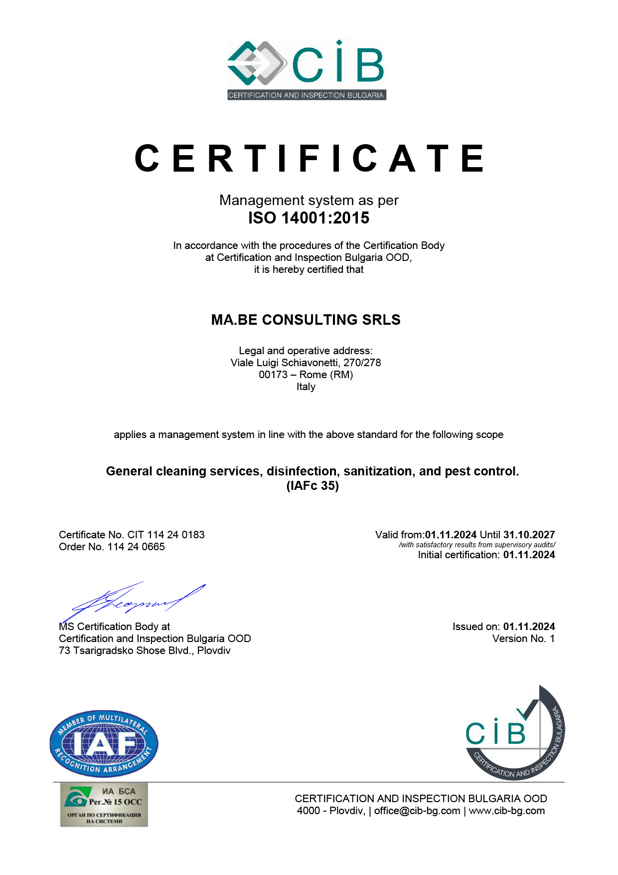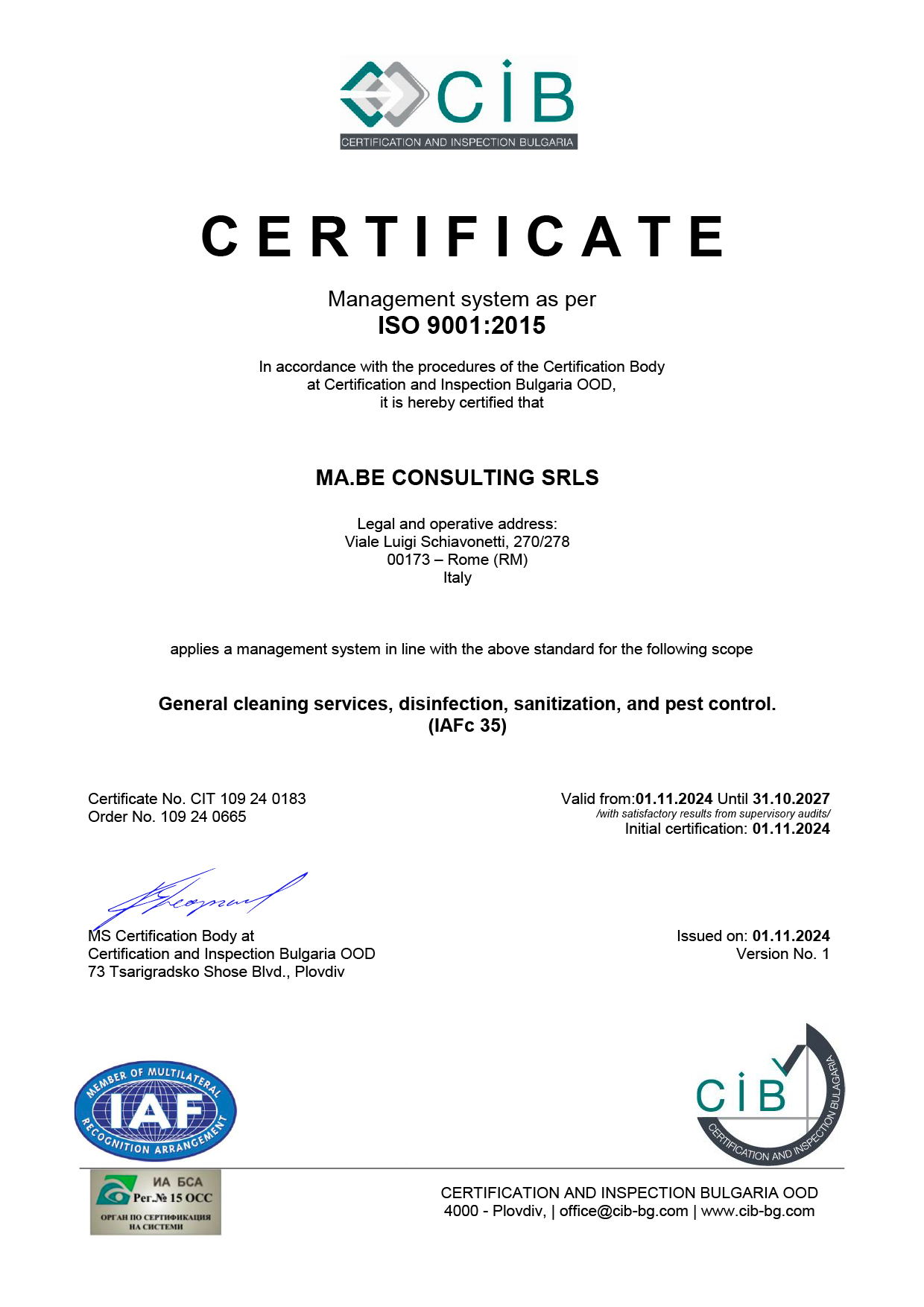 Scegliere un'azienda certificata significa affidarsi a un partner affidabile e competente. Le nostre certificazioni sono la garanzia che riceverai servizi di pulizia di altissima qualità, eseguiti con professionalità e nel pieno rispetto delle normative vigenti.